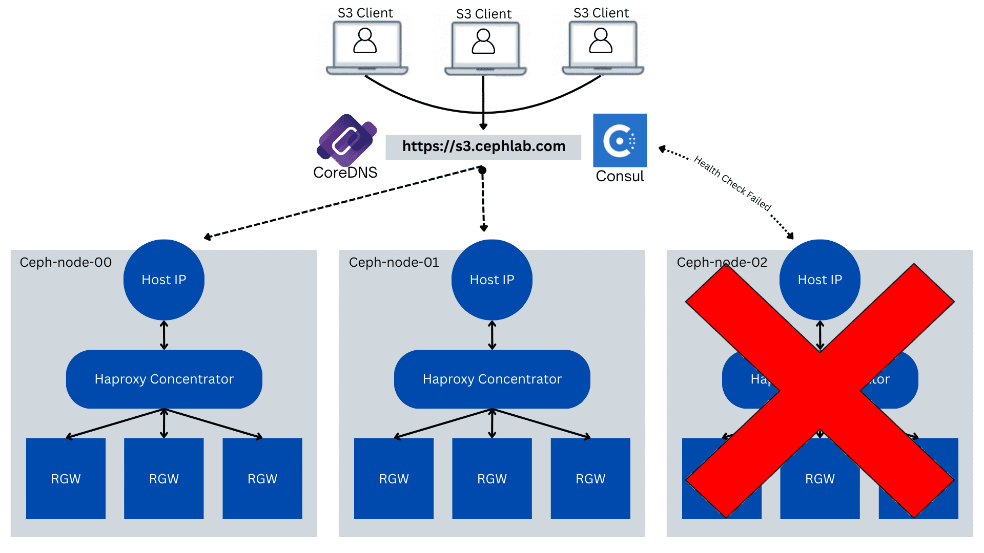 With this setup, DNS resolution remains distributed and highly available. Any Ceph node can resolve S3 bucket names locally and route clients to healthy ingress endpoints registered in Consul.