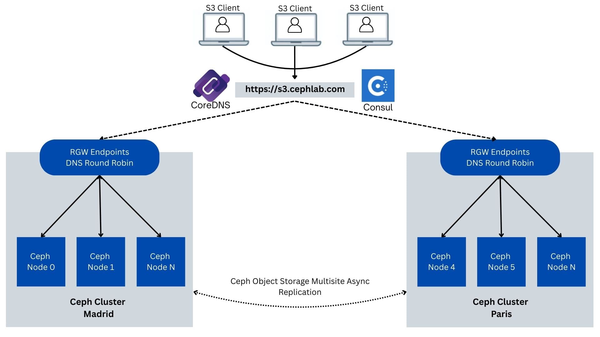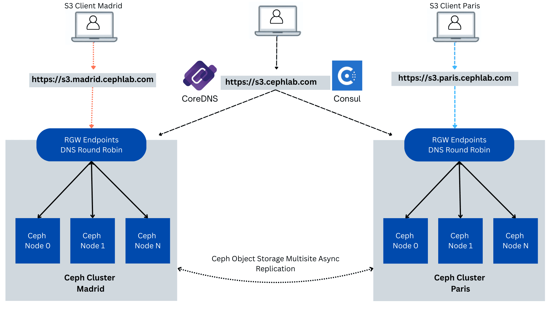 In Parts three and four, we combine Ceph Object Multisite (active/active data replication between Madrid and Paris Data Centers) with a Consul global load-balancing control plane, ensuring that the single S3 endpoint always routes to the closest healthy ingress and fails over across sites when needed, without requiring any client URL or SDK changes. Each site remains independent (its own control plane and Ceph cluster), while co-operating over the WAN so client requests always land on a healthy site.