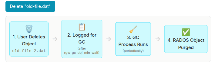 When clients delete S3 objects or overwrite them, the underlying RADOS objects are not immediately removed. The primary function of object deletion is to update the bucket index (or place a delete marker, if versioning is active). Once the S3 object is removed from the index, its underlying RADOS objects are effectively "orphaned."